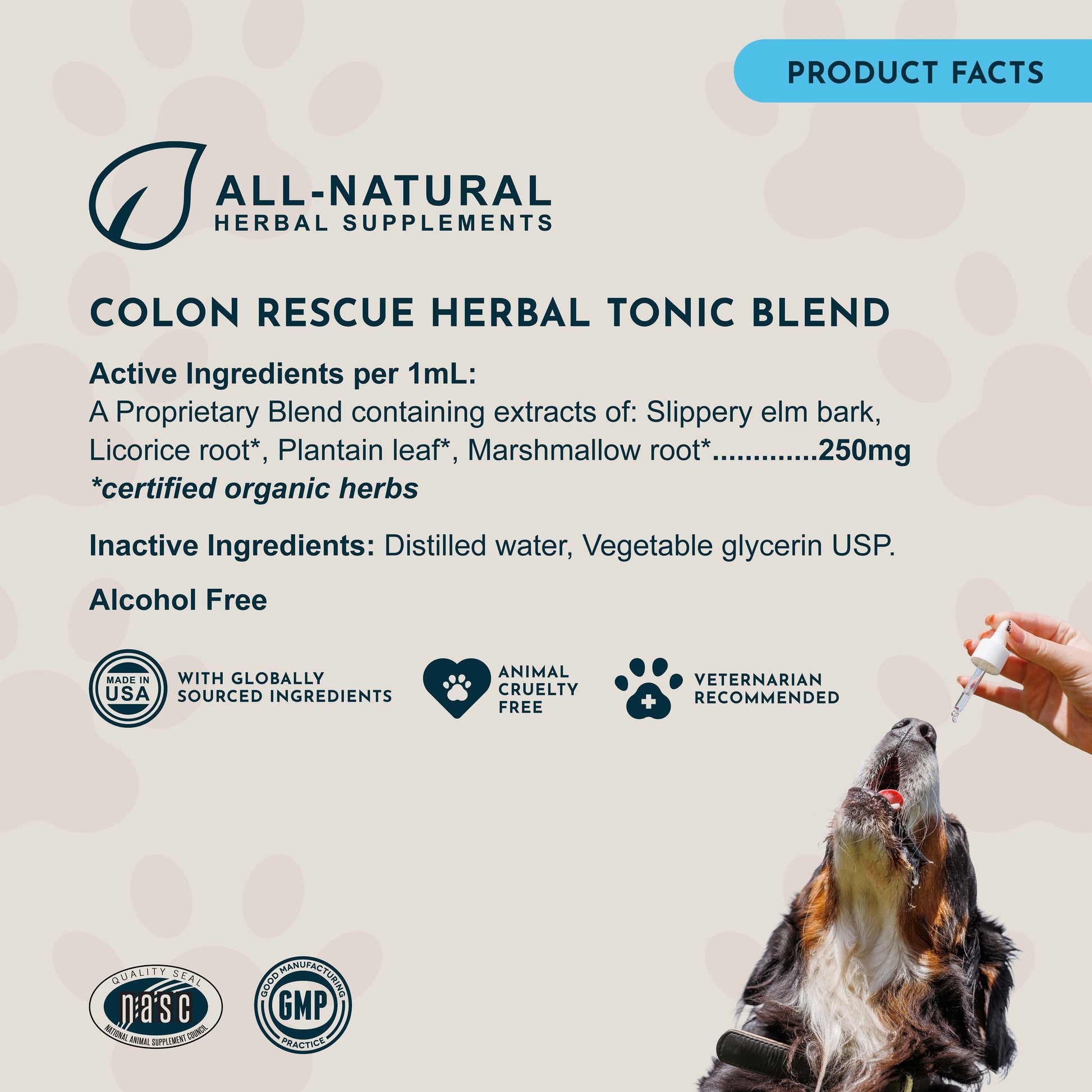 Yes, Colon Rescue is formulated to be safe for daily, long-term use. It can be added as part of your pet’s regular wellness routine, especially for those with sensitive digestion or occasional digestive upset. The gentle, mucilaginous herbs in this blend support healthy gut flora, soothe the digestive tract, and promote normal bowel function — without the harsh effects associated with pharmaceutical options.