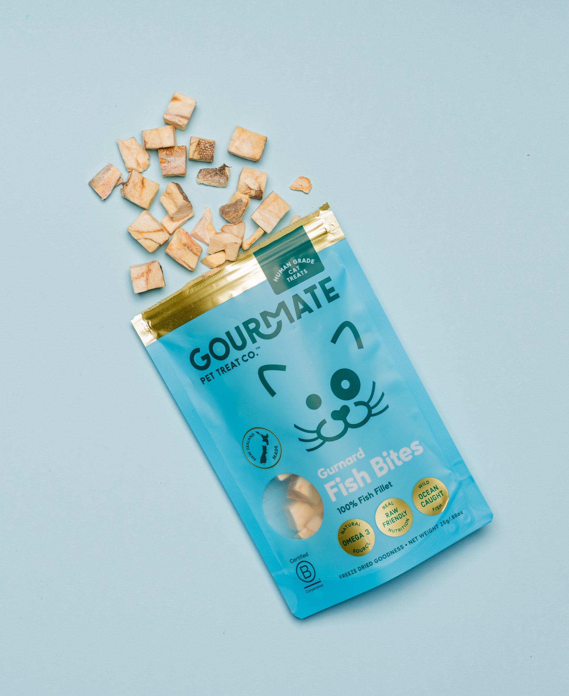 Gourmate's Gurnard Fish Bites for cats are a clean, species-appropriate, low-fat reward that support skin, coat, joint, and overall health, while satisfying your cat’s natural craving for fish.
