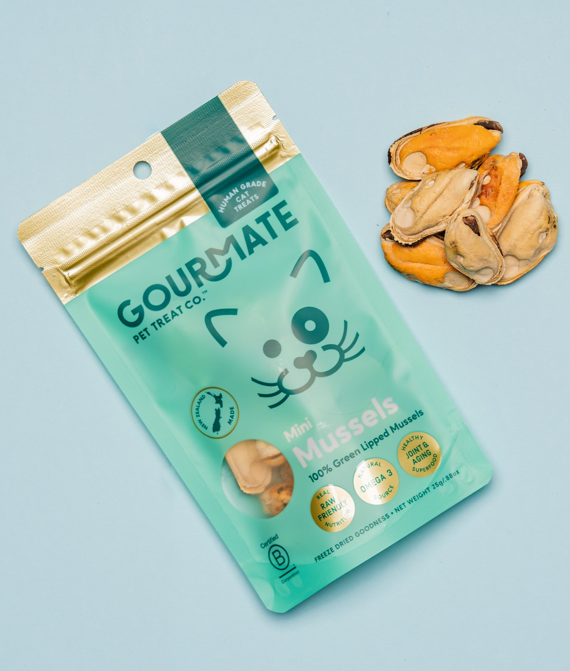Sustainably harvested from New Zealand’s pristine waters, Gourmate’s Mini Mussels for cats pack the same powerful nutrients as their green lipped mussels for dogs — in a size that's perfectly portioned for cats.