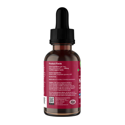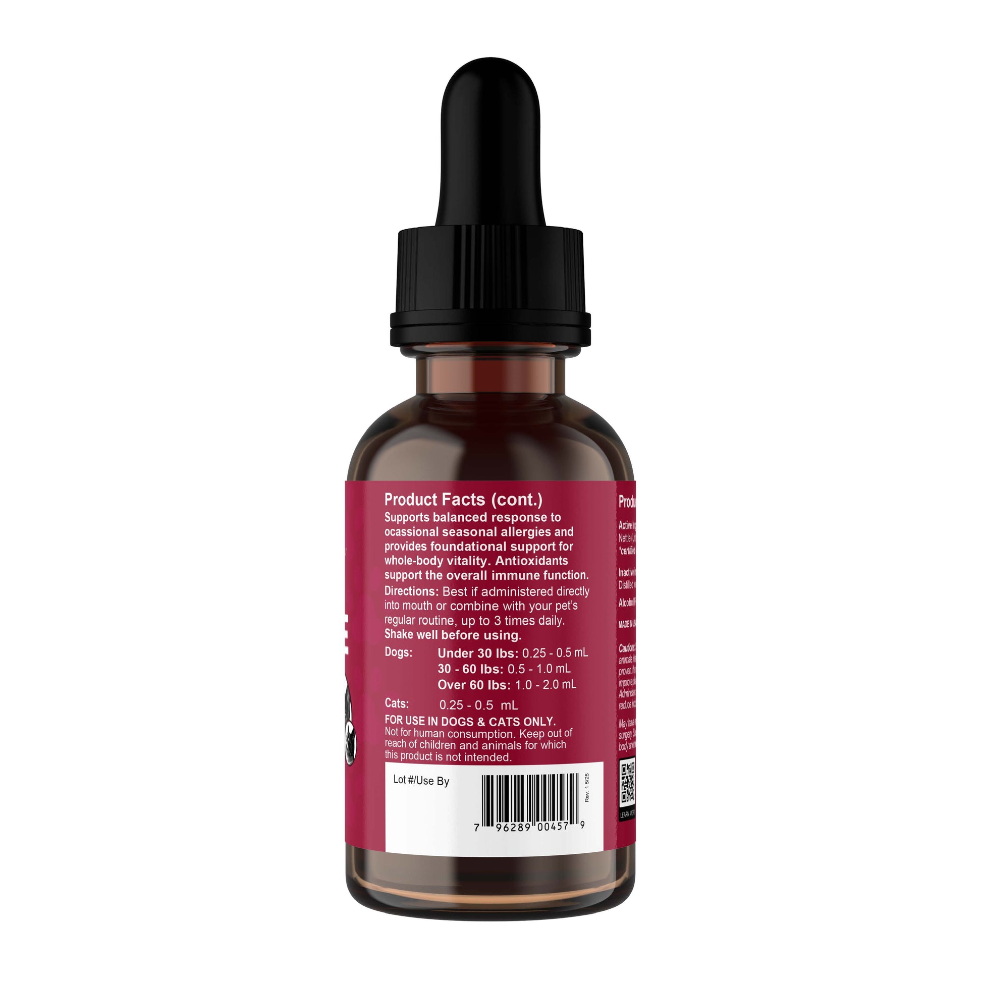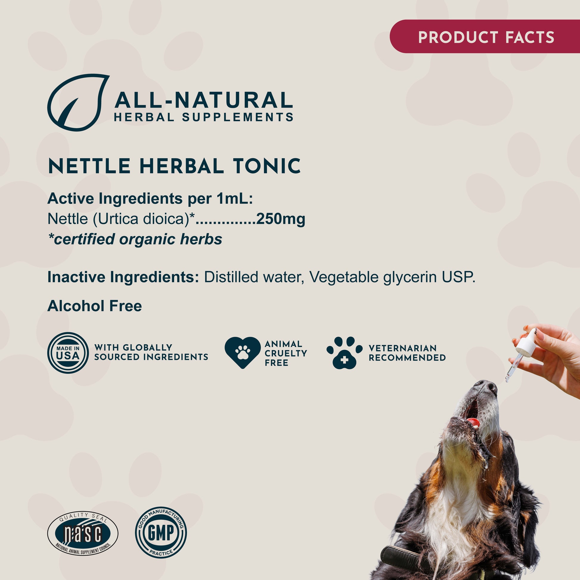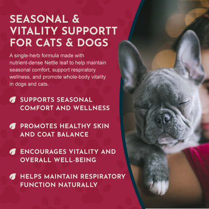 Living in Dubai, summer is a challenge, air conditioning nearly 24/7, and when outdoors there is extreme heat, dust, sand and and grass areas have goodness knows what pesticides and chemicals on them, so to add a small drop of this allergy support tonic to my dog’s meal is beneficial for her health.