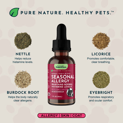 While both formulas share core ingredients — including Nettle Leaf, Burdock Root, Licorice Root, and Eyebright — the liquid Seasonal Allergy Tonic is a glycerin-based extract designed for quick absorption and gentle daily use. It’s ideal for pets with mild to moderate allergy symptoms.