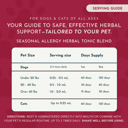 Start 2–4 weeks before your dog’s typical allergy season begins. This gives the herbs time to start working and gently regulate the immune response before allergen exposure intensifies. If you’re unsure when your dog’s allergy season starts, monitor for environmental triggers like tree pollination, grass cutting, or shifts in temperature. If allergy symptoms have already started, you can begin using the tincture immediately at the recommended dosage.