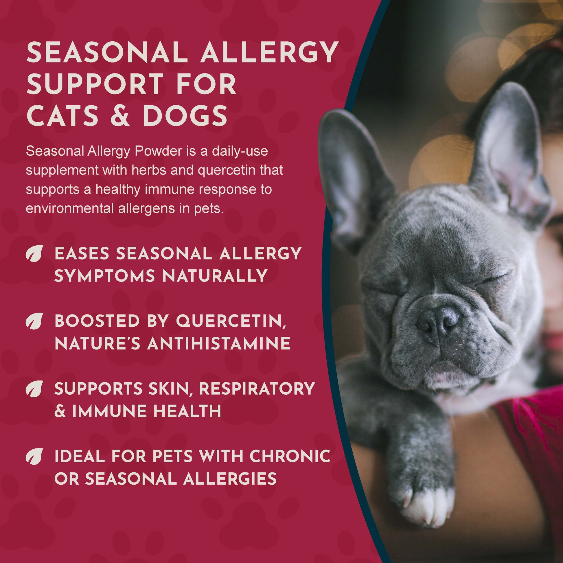 Seasonal Allergy Powder offers a natural and effective approach to tackling environmental and seasonal allergies in pets. With the added power of Quercetin — a powerful natural antihistamine and antioxidant — Seasonal Allergy Powder offers enhanced allergy relief for pets experiencing more intense discomfort and symptoms from exposure to allergens. For most effective results, its best to start using Seasonal Allergy Powder at the early onset of allergy season for your pet. This gives the body time to manage the release of histamine, and ensures your pet stays comfortable all through allergy season.